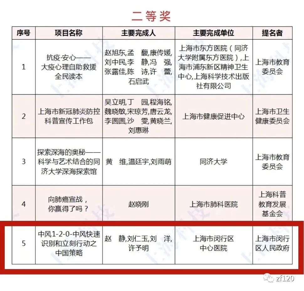 2020年上海市科学技术奖科学技术普及奖二等奖:赵静教授团队的“中风1-2-0-中风快速识别和立刻行动之中国策略”项目。